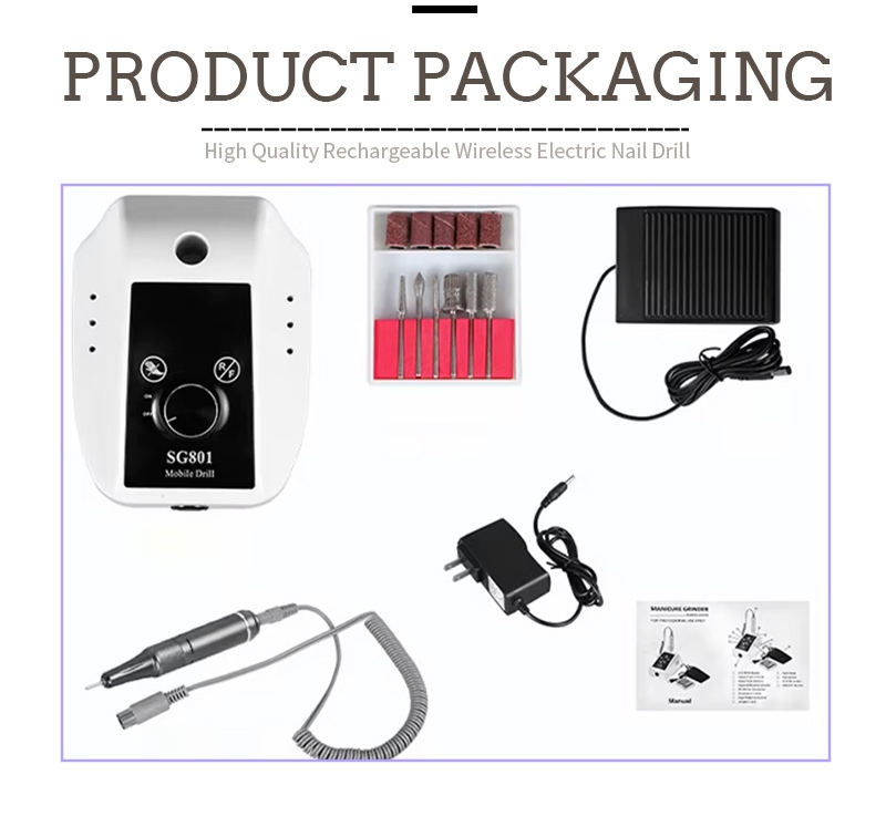 Sadržaj ovog paketa električne prijenosne bušilice za gel nokte od 35 000 okretaja u minuti sadrži proizvod s olovkom za brušenje, USB kabel za punjenje, priručnik s uputama za proizvod i laganu i prenosivu kutiju.