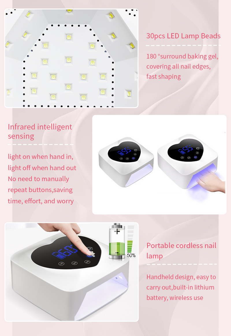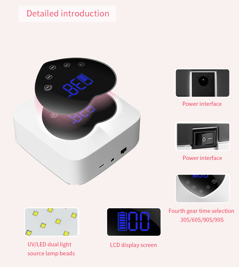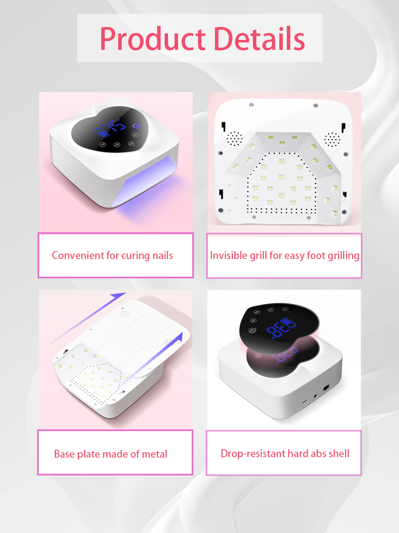 Proizvod osigurava ravnomjerno sušenje ljepila bez skupljanja. Njegovi dvostruki izvori svjetlosti pružaju nježno zagrijavanje kako bi se spriječila promjena boje ruku i naprezanje očiju, pogodan i za ruke i za noge, pružajući izvanredno brze rezultate sušenja.