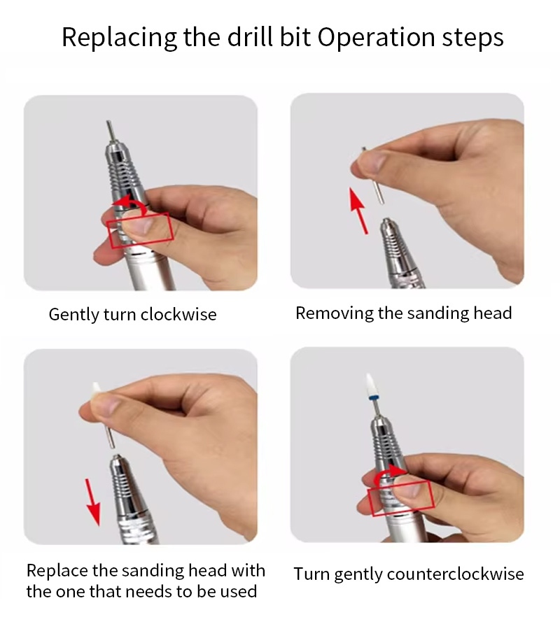 Ova ručna bušilica za nokte i stroj za poliranje zamjenske metode rada bušilice, to jest, uključite i izvucite, jednostavno i praktično, zamjena se može koristiti nakon završetka.