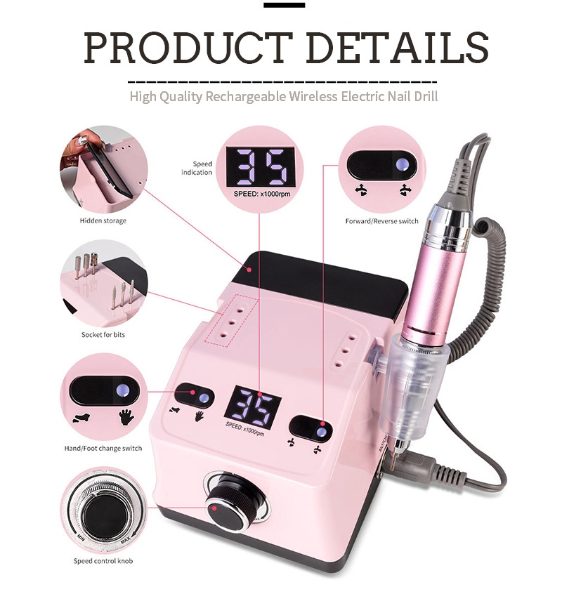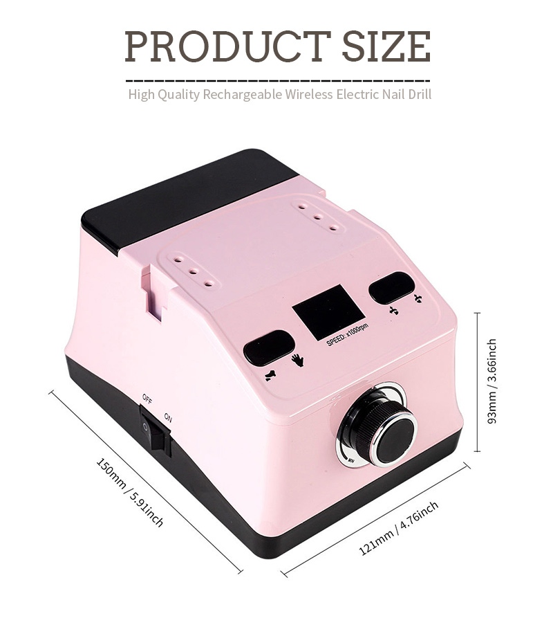 Dizajn zaslona ove ručne bušilice za nokte i stroja za poliranje ima prekidač za uključivanje/isključivanje i rotaciju naprijed/natrag za ukupno aktiviranje jednim gumbom, utičnicu za brzo punjenje na dnu, zamjenjivu utičnicu za bušilicu na vrhu i brzinu podesivu u tri položaja kako bi se zadovoljile razne potrebe.