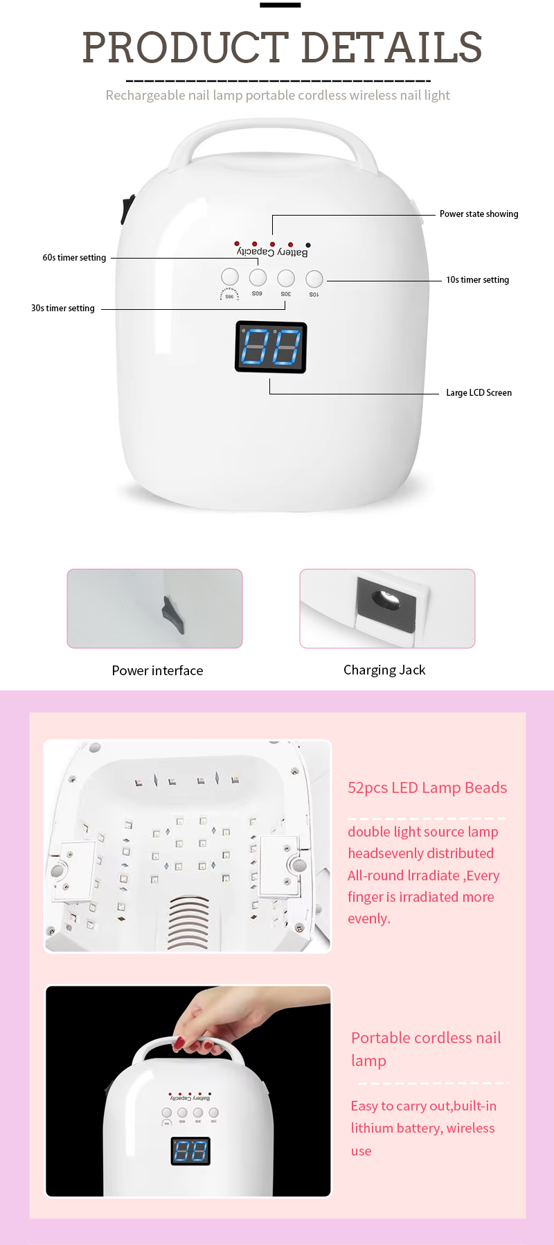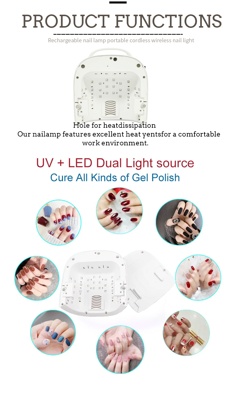Proizvod osigurava čak i sušenje ljepila bez skupljanja. Njegovi dvostruki izvori svjetlosti pružaju nježno grijanje kako bi se spriječilo uklanjanje boje i opterećenje očiju, pogodno i za ruke i noge, dajući nevjerojatno brzo sušenje rezultata.