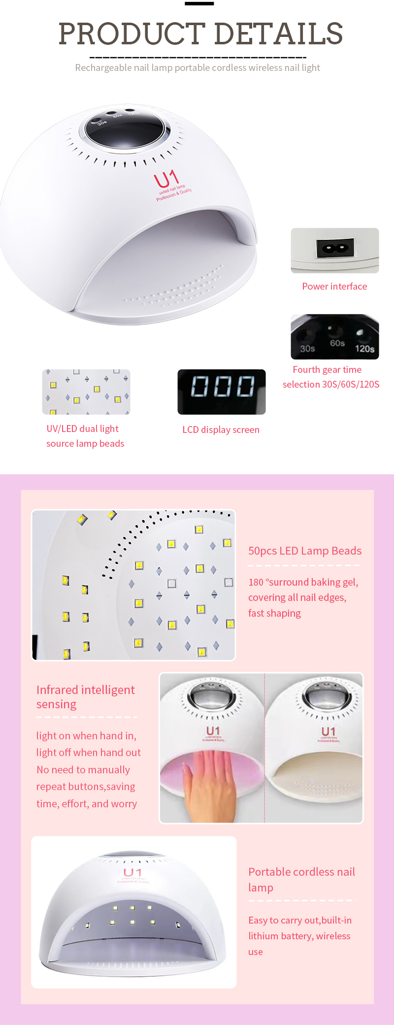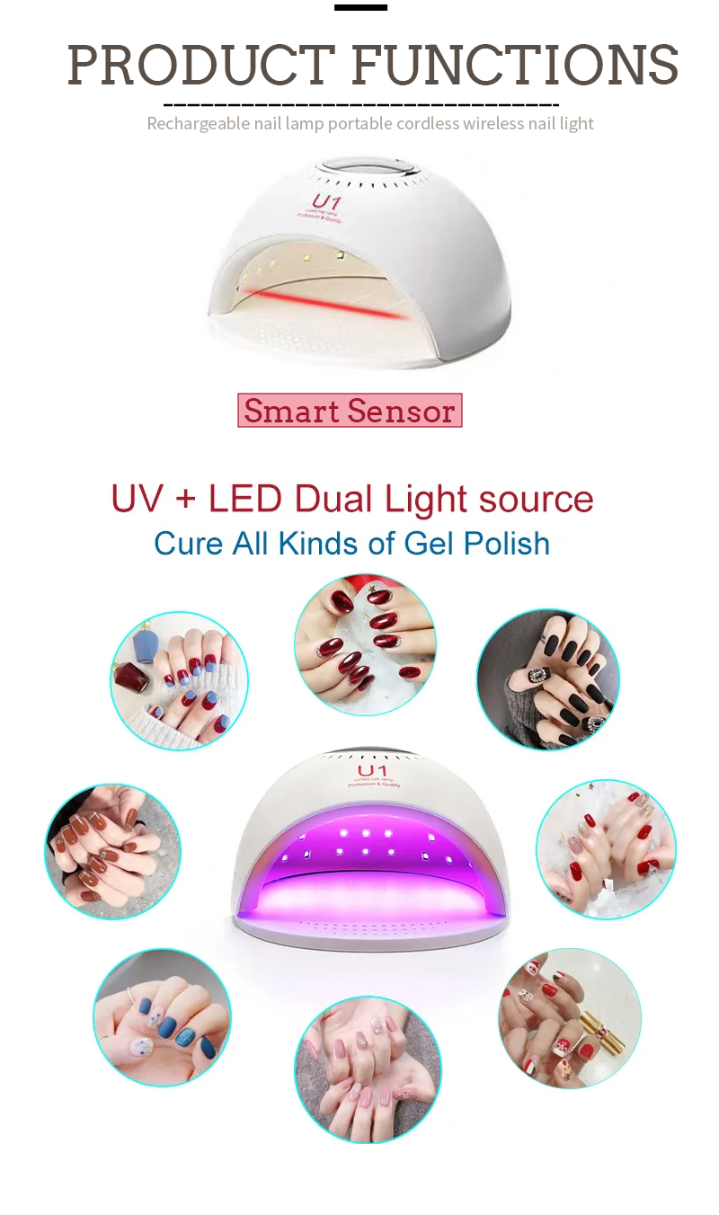 Proizvod osigurava ravnomjerno sušenje ljepila bez skupljanja. Njegovi dvostruki izvori svjetlosti pružaju nježno zagrijavanje kako bi se spriječila promjena boje ruku i naprezanje očiju, pogodan i za ruke i za noge, pružajući izvanredno brze rezultate sušenja.