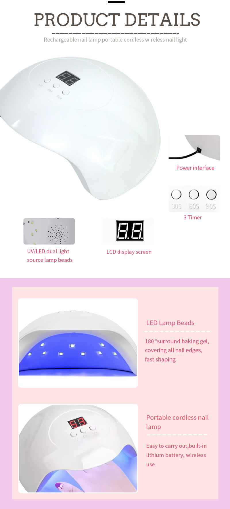 Proizvod osigurava čak i sušenje ljepila bez skupljanja. Njegovi dvostruki izvori svjetlosti pružaju nježno grijanje kako bi se spriječilo uklanjanje boje i opterećenje očiju, pogodno i za ruke i noge, dajući nevjerojatno brzo sušenje rezultata.