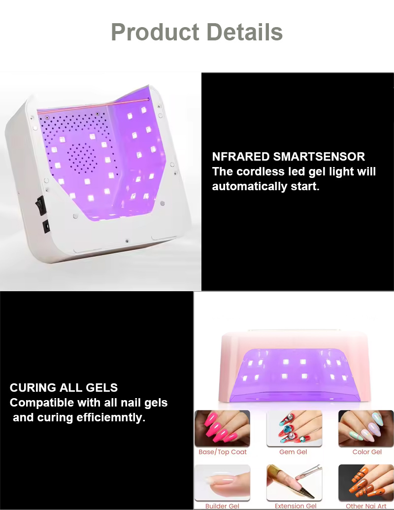 Naši glavni proizvodi uključuju LED svjetiljke za nokte: 186W/168W/86W/84W/80W/75W/72W/65W/60W/54W/50W/48W/36W/24W/16W/12W/6W/3W, itd. Punjivi bežični modeli: 156W/120W/96W/90W/86W/84W/80W/72W/66W/64W/60W/54W/48W itd. Bušilice za nokte: 80W/65W/60W/45W/35W/25W/15W itd. Modeli s bežičnim punjenjem: 45W, 35W, 30W, 25W, 20W, 15W, itd. 25000RPM/30000RPM/35000RPM/40000RPM/45000RPM/Bez četkica/Ultra-brzi bez četkica. Potpuni sakupljač prašine. 80W/68W/60W/48W/45W/40W/36W/30W/25W/20W/15W/6W itd., Modeli s bežičnim punjenjem: 80W, 60W, 40W, 30W.