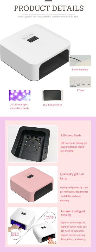 Visokokvalitetna lampa za brzo sušenje noktiju ima tehnologiju infracrvenog pametnog senzora koja automatski svijetli kada se ruke približe i isključuje kada se ruke odmaknu—eliminirajući gnjavažu stalnog pritiskanja gumba i štedeći vrijeme i trud. Ljepilo za pečenje velike snage ne zahtijeva dugo čekanje, štedi i vrijeme i trud.