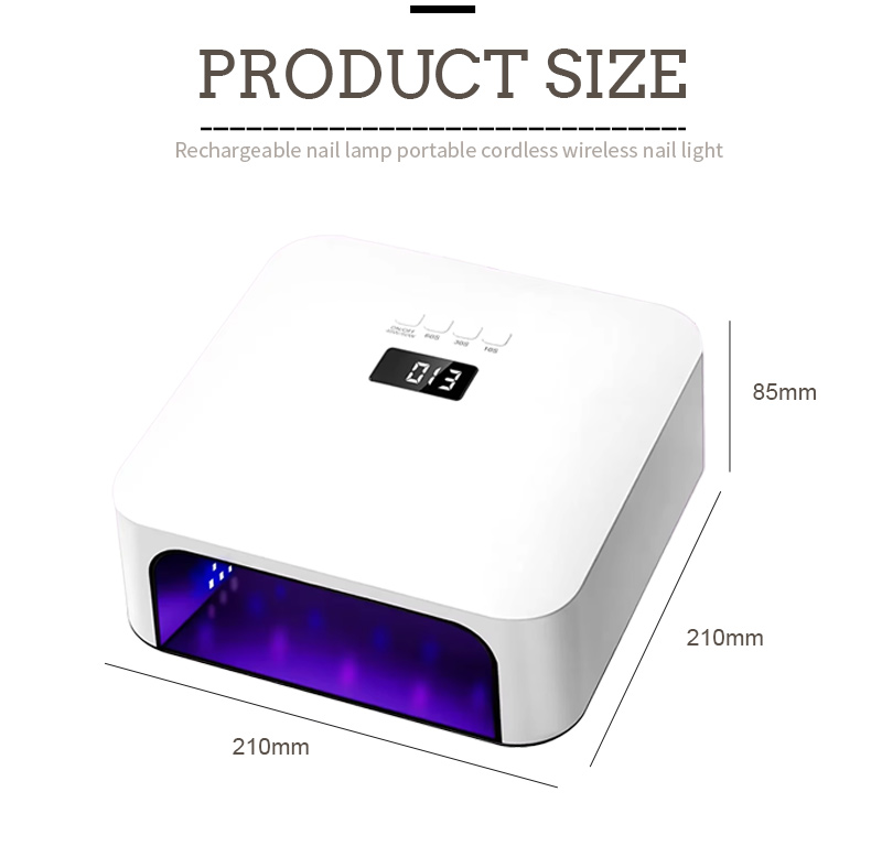 Dimenzije ove visokokvalitetne lampe za brzo sušenje noktiju su 210 mm duljine, 210 mm širine i 85 mm visine, velikog kapaciteta i mogućnosti korištenja ruku i nogu, što je vrlo zgodno.