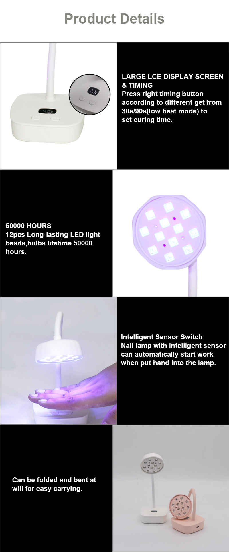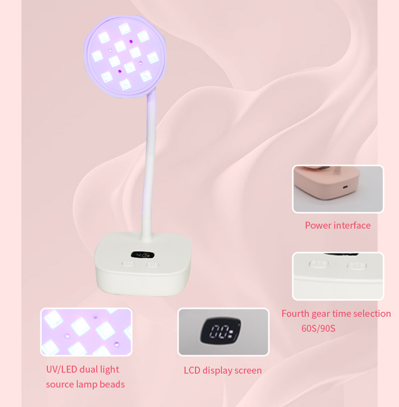 Proizvod osigurava ravnomjerno sušenje ljepila bez skupljanja. Njegovi dvostruki izvori svjetlosti pružaju nježno zagrijavanje kako bi se spriječila promjena boje ruku i naprezanje očiju, pogodan i za ruke i za noge, pružajući izvanredno brze rezultate sušenja.