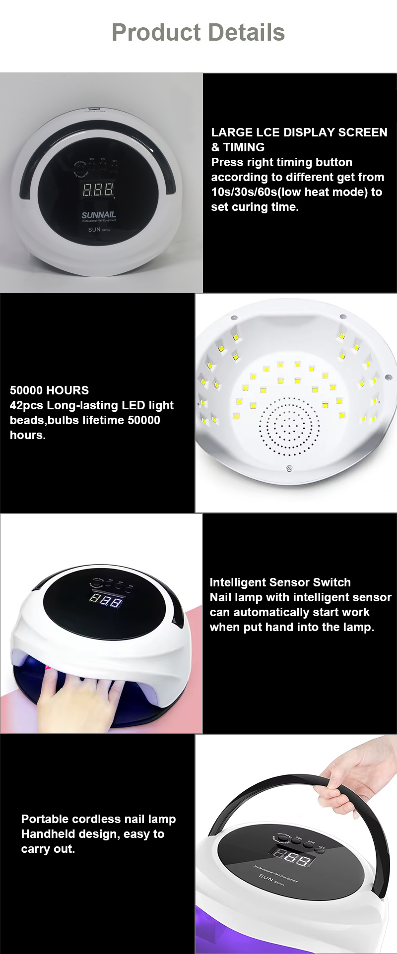 Lampa za sušenje noktiju s funkcijom automatskog senzora ima tehnologiju infracrvenog pametnog senzora koja automatski svijetli kada se ruke približe i isključuje kada se ruke odmaknu—eliminirajući gnjavažu uzastopnog pritiskanja tipki i štedeći vrijeme i trud. Ljepilo za pečenje velike snage ne zahtijeva dugo čekanje, štedi i vrijeme i trud.