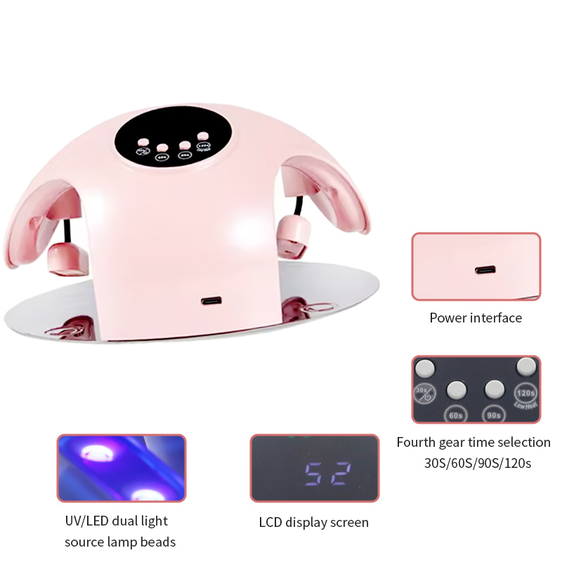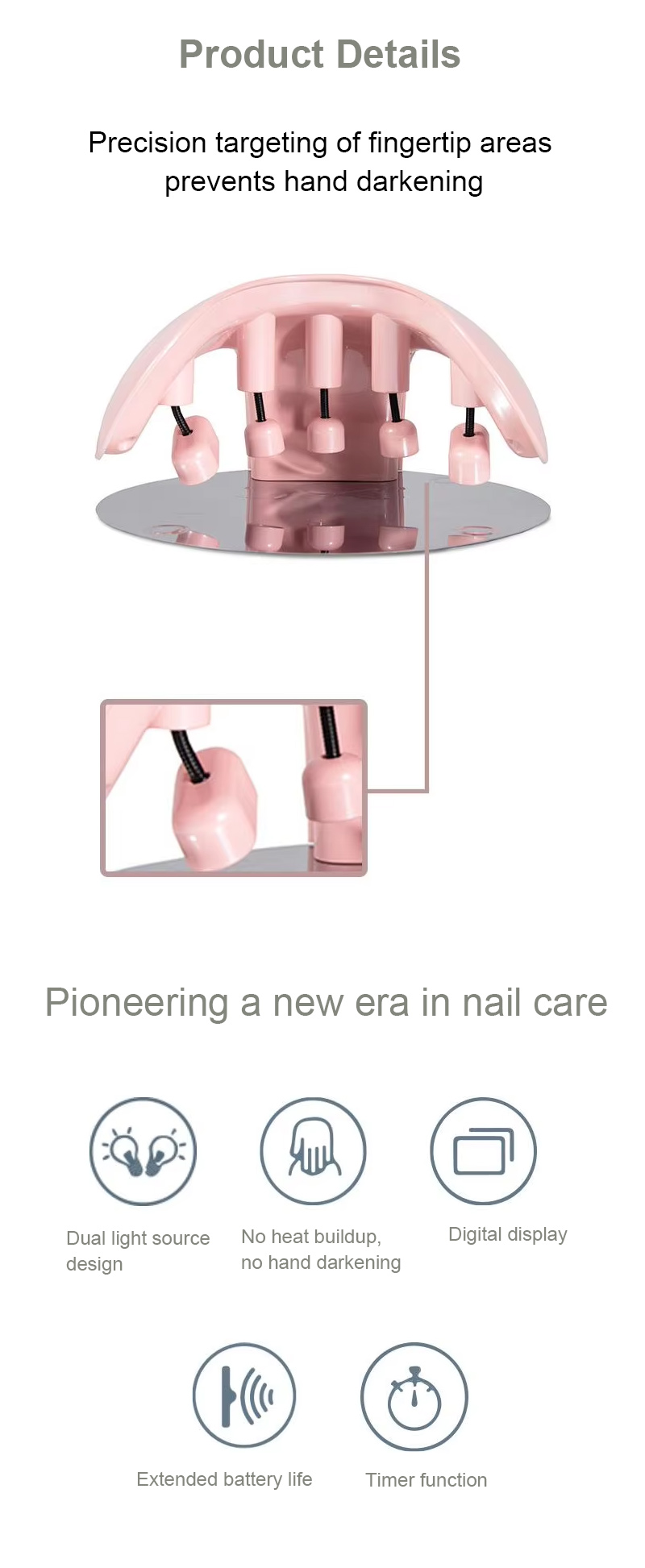 Proizvod osigurava ravnomjerno sušenje ljepila bez skupljanja. Njegovi dvostruki izvori svjetlosti pružaju nježno zagrijavanje kako bi se spriječila promjena boje ruku i naprezanje očiju, pogodan i za ruke i za noge, pružajući izvanredno brze rezultate sušenja.