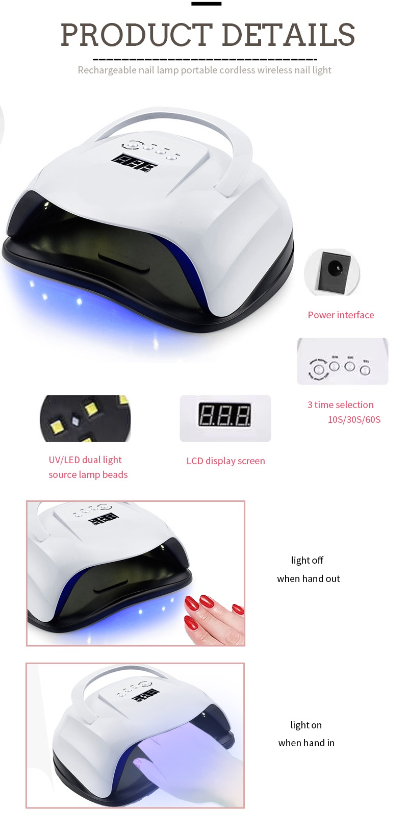Prijenosna lampa za sušenje noktiju ima tehnologiju infracrvenog pametnog senzora koja automatski svijetli kada se ruke približe i isključuje kada se ruke odmaknu—eliminirajući gnjavažu uzastopnog pritiskanja gumba i štede vrijeme i trud. Ljepilo za pečenje velike snage ne zahtijeva dugo čekanje, štedi i vrijeme i trud.