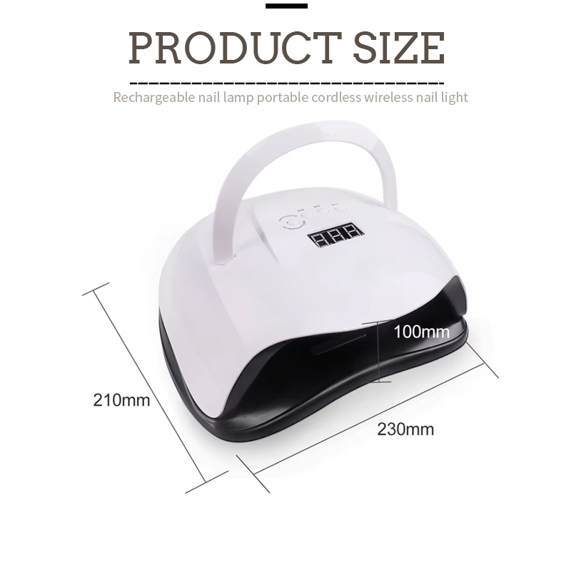 Dimenzije prijenosne lampe za sušenje noktiju su 180 mm duljine, 190 mm širine i 85 mm visine, s velikim kapacitetom i mogućnošću korištenja ruku i nogu, što je vrlo zgodno.