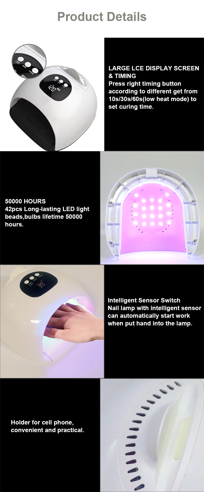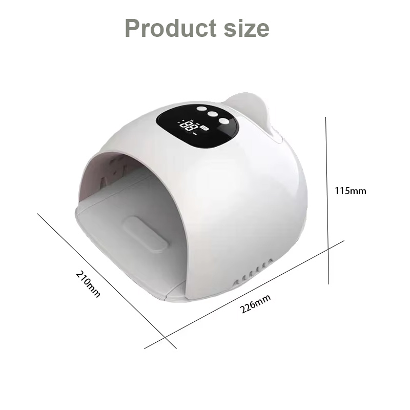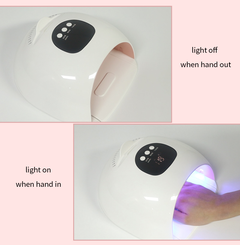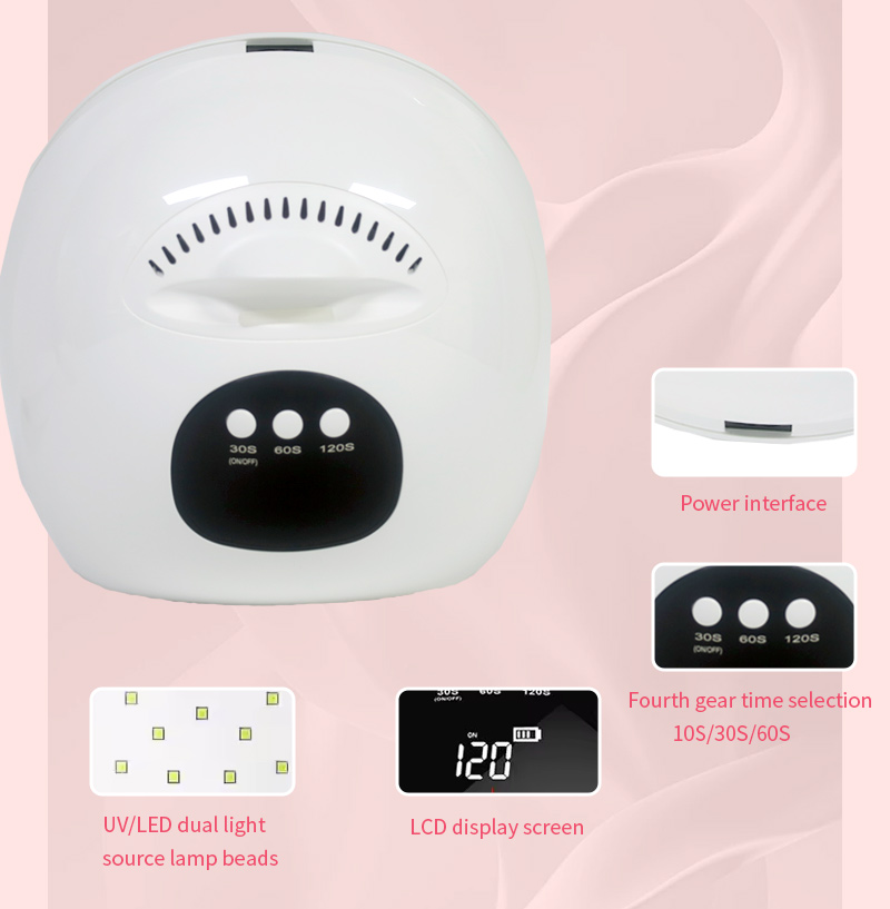 Proizvod osigurava ravnomjerno sušenje ljepila bez skupljanja. Njegovi dvostruki izvori svjetlosti pružaju nježno zagrijavanje kako bi se spriječila promjena boje ruku i naprezanje očiju, pogodan i za ruke i za noge, pružajući izvanredno brze rezultate sušenja.