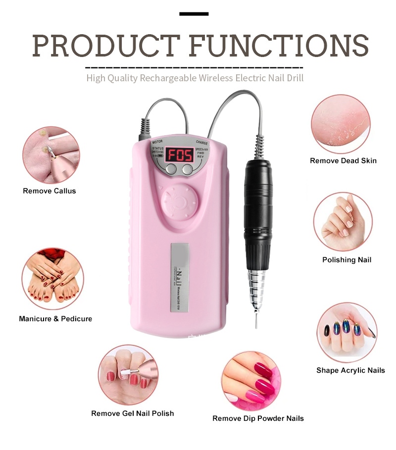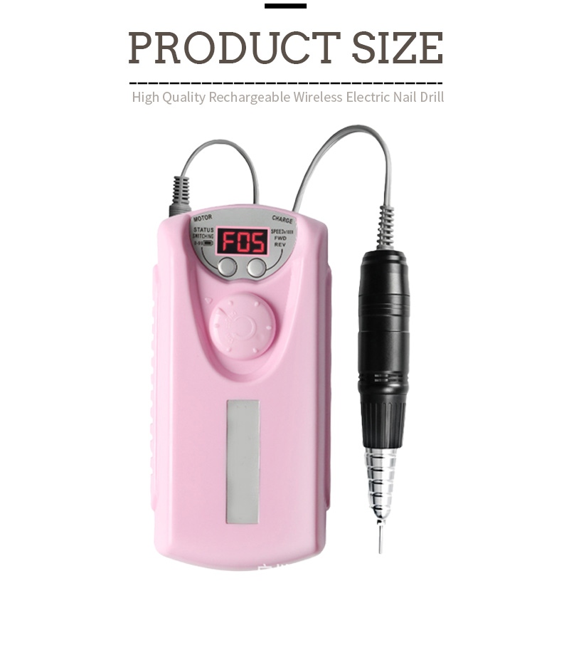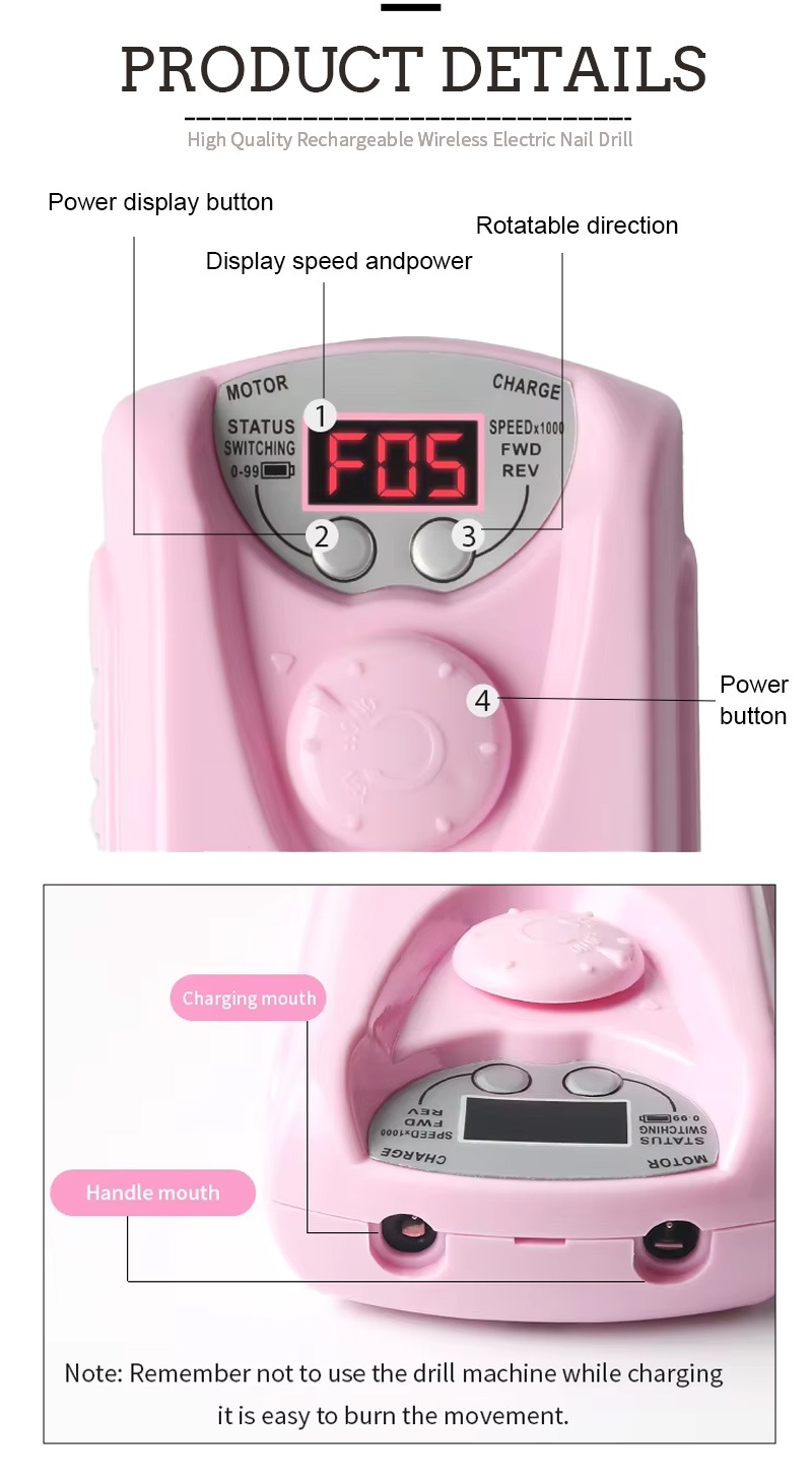 Dizajn zaslona ove profesionalne bežične električne bušilice za nokte ima prekidač za uključivanje/isključivanje i rotaciju naprijed/natrag za ukupno aktiviranje jednim gumbom, utičnicu za brzo punjenje na dnu, zamjenjivu utičnicu za bušilicu na vrhu i brzinu podesivu u tri položaja za zadovoljavanje raznih potreba.