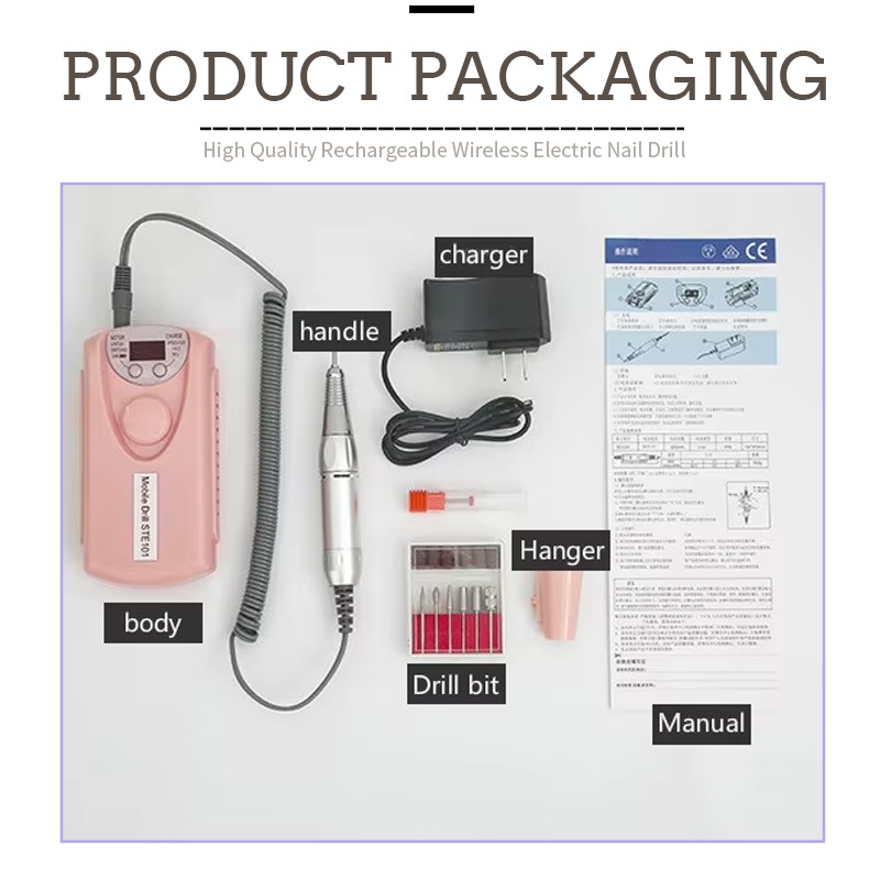 Sadržaj ovog pakiranja profesionalne bežične električne bušilice za nokte sadrži proizvod s olovkom za brušenje, USB kabel za punjenje, priručnik s uputama za proizvod i laganu i prenosivu kutiju.